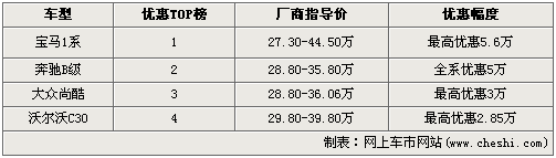 看完排行榜匯總表后不難發(fā)現(xiàn),定位于30萬(wàn)上下的進(jìn)口緊湊級(jí)別車型日子似乎都不太好過(guò),全部都有2萬(wàn)以上的優(yōu)惠幅度。其中優(yōu)惠幅度最高的車型是寶馬1系,最高優(yōu)惠5.6萬(wàn),全新上市的運(yùn)動(dòng)限量版也有1.9萬(wàn)元優(yōu)惠,該款車型全國(guó)限量480臺(tái),性價(jià)比表現(xiàn)不錯(cuò)。優(yōu)惠最少的是沃爾沃C30,一款個(gè)性突出的兩門緊湊車型,最高優(yōu)惠2.85萬(wàn)元。