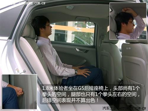 很多人考慮G5的另一個(gè)因素是它中型車尺寸帶來的良好空間,不過實(shí)際上它的軸距只有2700mm,在中型車中屬于中下水平,實(shí)際乘坐也是如此,身高180cm的體驗(yàn)者坐入后排,頭頂和腿部都只有一拳左右的空間。不過較長(zhǎng)的車尾也提供了不錯(cuò)的行李箱空間。