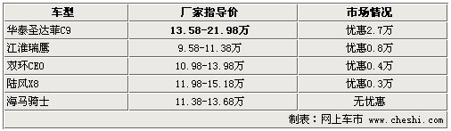 在五款自主品牌SUV中除了上市時(shí)間不長(zhǎng)的海馬騎士外,其他4款車型均有不同程度的優(yōu)惠。其中華泰圣達(dá)菲2.7L版本車型出現(xiàn)了2.7萬的最高優(yōu)惠,其他三款車的優(yōu)惠程度一般。
