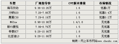 通過(guò)以上表格,我們可以清楚的看出,7款車(chē)當(dāng)中,除了上市時(shí)間比較久的海馬歡動(dòng)和力帆620以外,其他幾款車(chē)型都僅有小幅度降價(jià)或不降價(jià)。由于幾款車(chē)型剛剛上市不久,所以我們對(duì)它們價(jià)格優(yōu)惠的期望也并不大。
