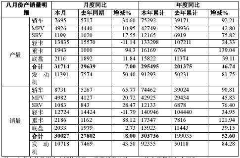 江淮汽車9月6日晚間發(fā)布2010年8月份產銷快報,公司8月份總產量為3.17萬臺,同比增長7%;總銷量為3萬臺,同比增長8%。公司1-8月累計總產量為29.54萬臺,同比增長46.73%,總銷量為30.37萬臺,同比增長52.6%。