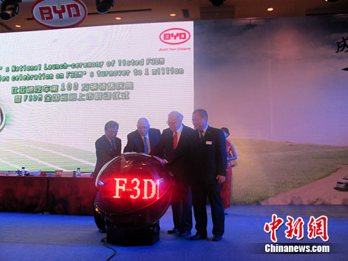 中新社深圳9月27日電(記者 鄭小紅)27日下午,隨著股神巴菲特親手將一輛F3DM鑰匙交付給比亞迪車(chē)主,比亞迪汽車(chē)迎來(lái)了銷(xiāo)售突破100萬(wàn)輛的歷史時(shí)刻。