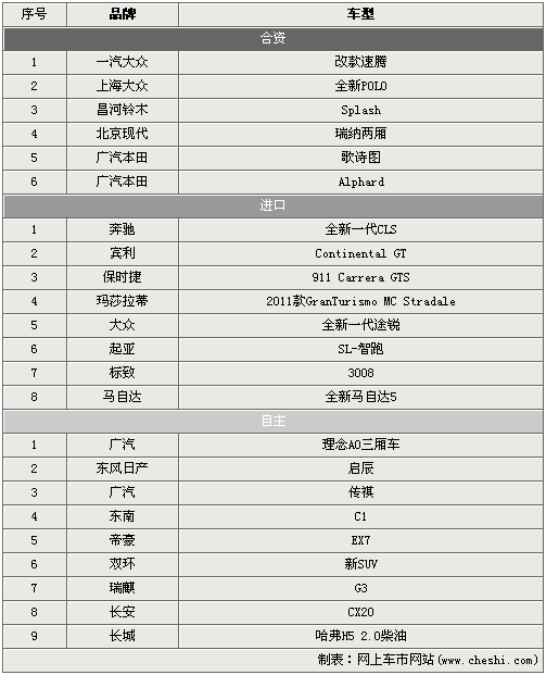 從表中可以看出,在2010年第四季度(10-12月)共有23款新車將于消費者見面。合資品牌品牌共有6款車型登場,上海大眾的全新POLO和廣汽本田的歌詩圖是關(guān)注度相對高的兩款明星車型;進口陣營中奔馳全新CLS已經(jīng)被炒得非;馃,而售價低很多的起亞SL-智跑則會引起共多SUV愛好者的注目;自主幫派以9款新車雄居榜首,第四季度這部分的特點在于有全新的品牌加入戰(zhàn)局,廣汽、東風等合資品牌都將下一步的計劃投身到自主品牌的浪潮之中。