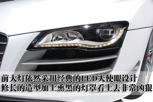 奧迪R8 GT的前大燈依然采用奧迪比較經典的LED天使眼設計,修長的造型風格再加上熏黑燈罩,看上去顯得非常兇狠。另外,奧迪R8 GT為了追求輕量化,這款車的前風擋也采用了更薄更堅固的玻璃材料。