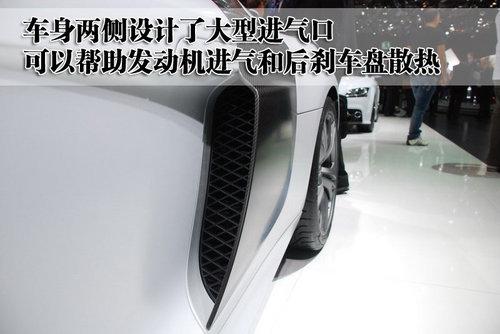 奧迪R8 GT與普通版R8在車身尺寸上并沒有變化,依然是一付短小精悍的風格。但奧迪R8 GT增加的那些運動套件卻使這款車更加強大。車身兩側最為顯眼的就是這個大型進氣口,可以幫助發(fā)動機進氣,并且由于主后剎車盤散熱。