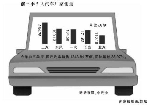 中國(guó)汽車工業(yè)協(xié)會(huì)昨日發(fā)布最新統(tǒng)計(jì)數(shù)據(jù)稱,今年前三季度,國(guó)產(chǎn)汽車產(chǎn)銷1308.27萬(wàn)輛和1313.84萬(wàn)輛,同比增長(zhǎng)36.10%和35.97%,逼近去年全年水平。而全年銷量或?qū)⒊^(guò)美國(guó)歷史最高銷量,達(dá)到1700萬(wàn)輛,并在2015年實(shí)現(xiàn)2500萬(wàn)輛產(chǎn)能規(guī)模。