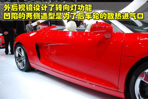 奧迪R8 4.2L敞篷版的外后視鏡也設計了轉向燈功能,而且逐步凹陷的兩側車身造型是為了后車輪的散熱進氣口而設計,而且也非常符合空氣動力學原理。奧迪R8 4.2L敞篷版配備了19英寸運動型輪轂,采用超低扁平比輪胎和通風剎車盤,可以提高車輛的抓地力和制動效果。奧迪R8 4.2L敞篷版車身大多采用鋁制金屬材料,作為一款中置發(fā)動機產品,巨大的掀背門下面隱藏著強勁的引擎,并且表面還設計了很多散熱進口。