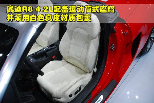 奧迪R8 4.2L敞篷版配備了運動型筒式座椅,并采用了白色真皮材質(zhì)包裹,與內(nèi)飾的整體色調(diào)相反,看上去個性鮮明。這款新車的座椅以及靠背兩側(cè)都比較突出,對身體的包裹性非常不錯,而且也采用了8向電動調(diào)節(jié)功能,方便駕駛員或乘員調(diào)整到最合適的坐姿。