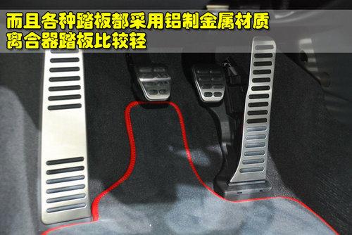 奧迪R8 4.2L敞篷版由于標配的是六速手動變速箱,油門、剎車以及離合器踏板都是采用輕量化的鋁制金屬材質(zhì),而且還配備了左腳休息踏板,離合器踏板的力度比較輕,但看上去制動踏板有些偏小,并沒有經(jīng)過特殊的設(shè)計。