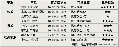通過上表列出了8款比較熱銷的SUV車型,可以看出,主要競(jìng)爭(zhēng)對(duì)手CRV和ix35 均無優(yōu)惠,CRV銷售方式依然高調(diào),購(gòu)車需加裝飾。其他韓日車系,優(yōu)惠幅度都在1.5萬元以上,其中獅跑和途勝最高優(yōu)惠高達(dá)3萬元,另外大眾品牌的途觀也是供不應(yīng)求,購(gòu)車需加1.5萬元裝飾。權(quán)衡哪一款SUV最適合自己、最具性價(jià)比,才是消費(fèi)者最為關(guān)注的,下面就詳細(xì)為大家介紹一下。