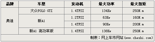 從表中可以看出,巴黎車展奧迪帶來的高功率版A1搭載的1.4TFSI擁有“缸內(nèi)直噴+機械曾也+渦輪增壓”三項技術(shù),經(jīng)過特殊調(diào)教,功率超過大眾POLO GTI有4Kw,達(dá)到138Kw,為小型車功率之冠;最大扭矩達(dá)到250N.m。百公里加速僅為6.9秒,是一款名副其實的勁量小鋼炮。