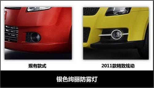 2011款雨燕在外型上與現(xiàn)款車型相比有了很大突破,甚至能夠稱之為運動款,運動元素遍布整個車身。前大燈、霧燈裝飾、前保險杠、進氣格柵均進行了重新設(shè)計。前臉上巨大的進氣口和黑底的前大燈顯得酷勁十足且更具侵略性;霧燈區(qū)域的變化也很搶眼,原本與條紋格柵相一致的黑色霧燈經(jīng)過銀色裝飾后,視覺沖擊力更強。車身側(cè)面增加了空氣動力學側(cè)圍裙邊,動感魅力更加明顯。