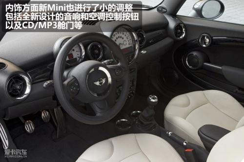 內(nèi)飾方面新MINI也進行了小的調(diào)整,其中包括全新設計的音響和空調(diào)系統(tǒng)控制按鈕、以及CD/MP3艙門等。配置方面將增加升級版收音機、MP3/CD播放器、AUX接口微型導航儀、彩色行車電腦顯示器、藍牙和USB音頻接口等。