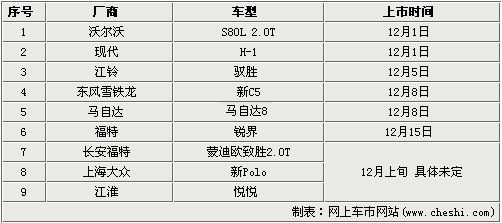 其中,在12月1日就將有兩款新車上市,分別為S80L 2.0T和現(xiàn)代H-1,另外還有江鈴馭勝、新C5、馬自達(dá)8等三款新車也確定了具體上市時間,而江淮悅悅、新Polo、GX2等4款車上市時間未定。從上表可以看到,這9款新車涵蓋了小型車、中級車、豪華車、SUV及商務(wù)車等不同類型,可以滿足消費者各項用車需求。