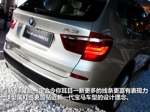 更大面積的雙腎型進氣格柵,以及比舊款更加炯炯有神的大燈總成,一舉掃去了舊款老成持重的感覺。明顯外拋的前翼子板以及與3系類似的多棱線發(fā)動機蓋,更顯示出X3強而有力的性格。