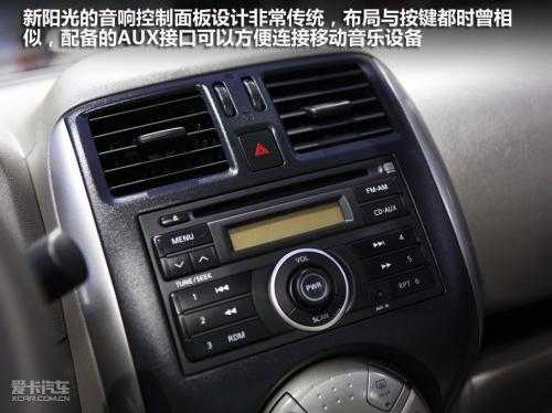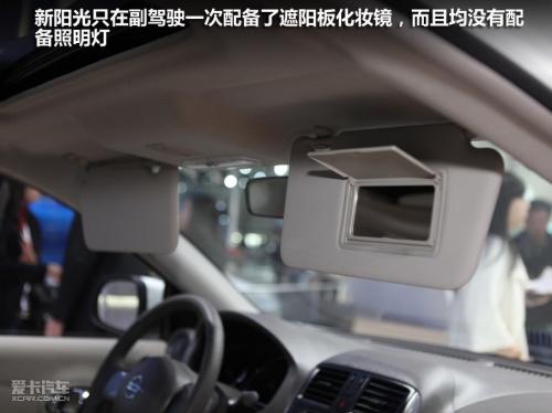 新陽光的音響控制面板設計十分傳統(tǒng),布局與按鍵都與現(xiàn)在主流的日產(chǎn)車型一致,并沒有什么新鮮感。倒是圓形的自動空調控制面板設計的非?蓯,是新陽光內飾的一大亮點,而且操作起來沒有任何難度。新陽光只有副駕駛位置配備了遮陽板化妝鏡,而且沒有配備照明燈,讓人有些不解。