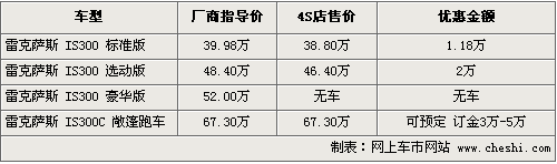 據(jù)4S店銷售人員介紹,目前雷克薩斯IS300系列有普通轎車和敞篷硬頂跑車兩個(gè)系列,其中敞篷跑車的售價(jià)已經(jīng)公布,售價(jià)為67.3萬元,各經(jīng)銷商處可以接受預(yù)訂,訂金為3萬-5萬不等,7月首批新車即可到店。據(jù)銷售人員介紹哦G-BOOK智能副駕系統(tǒng)是這款車的最大亮點(diǎn)。同時(shí)轎車版三款車目前只有IS300選動(dòng)版現(xiàn)車供應(yīng),最高可優(yōu)惠現(xiàn)金2萬元。同時(shí),部分經(jīng)銷商還推出了購車送一年全車保險(xiǎn)的活動(dòng),保險(xiǎn)金額在1萬-2萬之間。