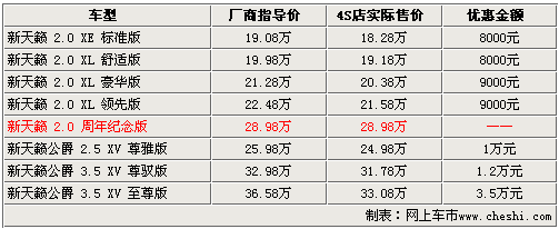 2009年6月16日,東風(fēng)日產(chǎn)推出了新天籟周年紀(jì)念版車型,售價(jià)為28.98萬。這款新車是在天籟2.5L車型的基礎(chǔ)上,增加了BOSE5.1ch環(huán)繞音響系統(tǒng)和超大型雙層全景天窗等舒適性配置,大大提升了這款車的性價(jià)比。近日,記者在走訪北京地區(qū)的東風(fēng)日產(chǎn)4S店時(shí)了解到:目前新天籟周年紀(jì)念版還沒有現(xiàn)車到店,目前預(yù)定的消費(fèi)者將在7月底提到現(xiàn)車。