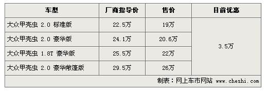 據(jù)4S店銷售人員介紹:目前甲殼蟲全系可優(yōu)惠3.5萬元,2.0標(biāo)準(zhǔn)版售價(jià)僅為19萬,但目前硬頂版甲殼蟲無現(xiàn)車,訂車需等半個(gè)月至兩個(gè)月。敞篷版目前現(xiàn)車較充足,喜歡的朋友可以不必等待漫長(zhǎng)的訂車時(shí)間。