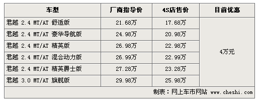 據(jù)4S店銷售人員介紹:由于新君越臨近上市,所以目前銷售的君越有大幅降價,最高降幅達到4萬元。目前除了混合動力版需預定外,其他車型貨源充足,全系優(yōu)惠4萬元。混合動力版預訂需等一個月時間,訂金1萬元。