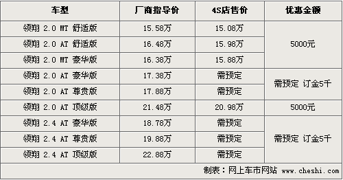 筆者從北京地區(qū)經(jīng)銷(xiāo)商處了解到,目前領(lǐng)翔全系優(yōu)惠幅度仍然保持在5000元。據(jù)店內(nèi)銷(xiāo)售人員介紹,除2.0舒適型和豪華型有部分現(xiàn)車(chē)供應(yīng)外,其他款仍需要預(yù)訂,訂金為5000元,15個(gè)工作日內(nèi)便可以交車(chē)。目前銷(xiāo)售的領(lǐng)翔在原來(lái)車(chē)型基礎(chǔ)上增加了2.0自動(dòng)舒適與2.0手動(dòng)豪華兩款車(chē),并在配置上有一定調(diào)整。消費(fèi)者可到店內(nèi)試駕體驗(yàn),了解詳細(xì)車(chē)型情況。