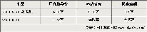 據(jù)比亞迪汽車北京地區(qū)4S店銷售人員介紹,目前北京在售的比亞迪F3R有兩款車型。1.5L手動(dòng)舒適版經(jīng)2000元的優(yōu)惠后售價(jià)從6.08萬降到了5.88萬元,1.6L自動(dòng)檔車型目前店內(nèi)沒有現(xiàn)車,所以不再此次優(yōu)惠隊(duì)列中。