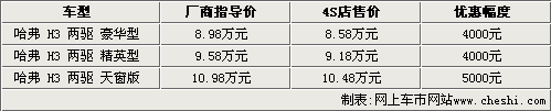 據(jù)長(zhǎng)城汽車(chē)4S店銷(xiāo)售人員介紹,長(zhǎng)城哈弗H3的現(xiàn)車(chē)都比較齊全,并且出現(xiàn)了較多的優(yōu)惠幅度。其中豪華型和精英型能夠優(yōu)惠4000元,而天窗版則優(yōu)惠5000元。另外銷(xiāo)售人員表示,長(zhǎng)城哈弗H3的廠商指導(dǎo)價(jià)只是白色普通漆車(chē)型,金屬漆其他顏色車(chē)型需要加價(jià)2000元。