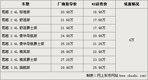 今年的7月8日,別克終于推出了帶著家族新元素特征的中級(jí)車市場(chǎng)的又一力作-新君越。新君越的加入無(wú)疑給別克軍團(tuán)再次打了一針“興奮劑”,其與新君威形成了很好的市場(chǎng)互補(bǔ)。別克經(jīng)銷店已經(jīng)可以接受新君越的預(yù)訂工作,訂金為10萬(wàn)元,并且為了清理老款君越的庫(kù)存車,老君越出現(xiàn)了全系降4萬(wàn)元的優(yōu)惠,具體價(jià)格請(qǐng)看下表: