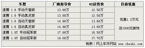 據(jù)4S店銷(xiāo)售人員介紹:目前速騰全系優(yōu)惠1.3萬(wàn)元,較之前優(yōu)惠幅度有所增加,如在店內(nèi)做一條龍服務(wù)還可獲贈(zèng)價(jià)值1000元的裝飾,裝飾主要包括腳墊、座套等。由于2.0升車(chē)型停產(chǎn),所以目前只有1.6升和1.8TSI車(chē)型。1.6升車(chē)型更注重經(jīng)濟(jì)型,而1.8TSI更加注重動(dòng)力表現(xiàn)。