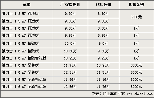 廣州豐田雅力士的新官方指導(dǎo)價已于今年3月開始實(shí)行,售價為9.20萬—12.56萬元。這其中包括了剛剛在3月新推出一款1.6E舒適版車型。目前相比前幾個月的優(yōu)惠幅度,雅力士的優(yōu)惠有所減少,目前最高優(yōu)惠1萬元,具體車型和價格如下: