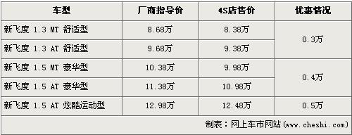 新飛度是廣州本田去年7月份上市的車型,其是廣州本田經(jīng)濟型轎車的主力軍,外形比起老款飛度更加前衛(wèi)更加時尚,創(chuàng)新的動感另類駕駛艙更是一大亮點。近日據(jù)網(wǎng)上車市網(wǎng)站價格系統(tǒng)監(jiān)測顯示,新飛度全系最高優(yōu)惠金額為5000元,具體詳情請看下表: