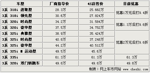 據(jù)4S店銷售人員介紹:目前寶馬3系全系車型都有一定幅度優(yōu)惠,最高降幅達(dá)到3.9萬元。雖然較之前的優(yōu)惠幅度有所減小,但是目前現(xiàn)車比較多,尤其寶馬318i系列與325i系列店內(nèi)現(xiàn)車充足,320i豪華型需預(yù)定,預(yù)訂需等1個(gè)月至2個(gè)月時(shí)間。據(jù)經(jīng)銷商介紹,寶馬318i進(jìn)取型將近停產(chǎn),所以喜歡這款車的朋友盡快到店內(nèi)訂車,目前店內(nèi)有少量現(xiàn)車顏色不全。在優(yōu)惠幅度上,寶馬318i系列在優(yōu)惠1萬元后可打9.4折,寶馬320系列兩款車型在優(yōu)惠1.3萬元后可打9.6折,325系列可優(yōu)惠2萬后再打9.6折。寶馬335i和320i雙門轎跑車無任何優(yōu)惠,預(yù)定車需等4-6個(gè)月。