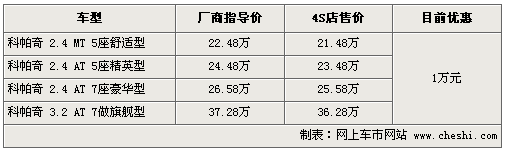 據(jù)雪佛蘭4S店銷售人員介紹:目前2.4升排量車型現(xiàn)車較為充足,顏色較齊全,白色、銀色現(xiàn)車很多,但無紅色車型,如預(yù)定需要等待1-2周時間。3.2車型依舊無現(xiàn)車,訂車需等一個月時間?婆疗嫒的壳翱蓛(yōu)惠1萬元現(xiàn)金,不送任何裝飾。