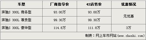 今年的上海車展上,改款奔馳S級與消費(fèi)者首次見面,據(jù)悉此款新奔馳S級將會(huì)在下個(gè)月正式上市。隨著新款奔馳S級的即將上市以及寶馬新7系入門級車型730Li的上市,現(xiàn)款在售的奔馳入門級車型S300L的價(jià)格會(huì)有什么變化呢?據(jù)了解,奔馳S 300L近期出現(xiàn)了最高4萬元的優(yōu)惠,具體價(jià)格詳情請看下表: