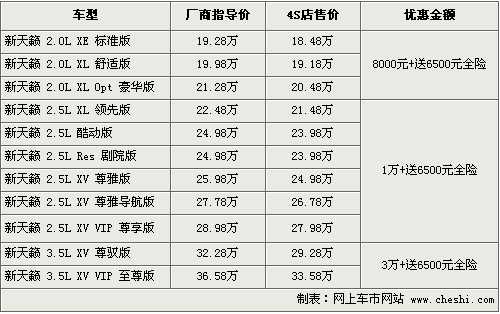 據(jù)4S店銷(xiāo)售人員介紹,目前新天籟全系車(chē)型可以贈(zèng)送價(jià)值6500元左右的全險(xiǎn),其中還有現(xiàn)金優(yōu)惠。2.0車(chē)型現(xiàn)金優(yōu)惠8000元,2.5車(chē)型優(yōu)惠1萬(wàn)元,而3.5車(chē)型則優(yōu)惠到了3萬(wàn)元,累計(jì)優(yōu)惠幅度最高為3.65萬(wàn)元。目前全系車(chē)型有黑色、紫色等可供消費(fèi)者選擇。