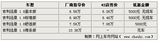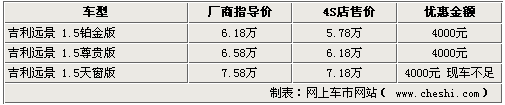 作為一款上市時(shí)間較長的車型,吉利遠(yuǎn)景系列近期也開始加大優(yōu)惠幅度促銷。網(wǎng)上車市網(wǎng)站近日由經(jīng)銷商處了解到,現(xiàn)在購買遠(yuǎn)景車型,將享受到最高5000元的現(xiàn)金優(yōu)惠,不過各家4S店內(nèi)的車型并不齊全,部分車型仍處于無車的狀態(tài)。具體詳情如下: