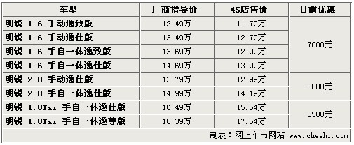 據(jù)4S店銷售人員介紹:目前明銳全系最高優(yōu)惠8500元,部分車型無現(xiàn)車,預(yù)定需等待1個半月至3個月時間。1.6升車型優(yōu)惠已達(dá)7000元,較之前優(yōu)惠幅度增加了1000元。2.0升車型優(yōu)惠仍為8000元,但個別經(jīng)銷商處有銀色、灰色現(xiàn)車,不過優(yōu)惠幅度最高僅6000元。1.8TSI的兩款車型優(yōu)惠8500元,較之前有所縮水,但目前經(jīng)銷商處有現(xiàn)車,顏色也較齊全。雖然1.6升車型優(yōu)惠幅度較之前有所增加,但目前依然沒有現(xiàn)車,需要預(yù)訂。如在店內(nèi)做裝飾還可打8折,雖然折后裝飾價格仍有些偏高,但產(chǎn)品質(zhì)量可以保證。