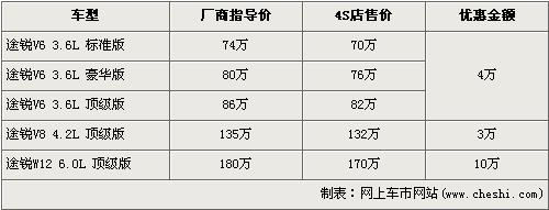 途銳是大眾首款引進(jìn)我國的SUV車型,在3.6L及4.2L率先上市后,大眾為了滿足消費(fèi)者的更大胃口,緊接著又推出了搭載12缸發(fā)動機(jī)的6.0L車型。隨著大排量消費(fèi)稅的頒布,給9月份后入關(guān)的大排量車型帶來了一次不小的沖擊,令大排量汽車價(jià)格都上調(diào)了不少,大眾途銳6.0L頂級版也從原來158萬元的價(jià)格上調(diào)至了180元。近日據(jù)網(wǎng)上車市價(jià)格系統(tǒng)監(jiān)測顯示,大眾途銳全系的最高優(yōu)惠達(dá)到了10萬元,具體詳情請看下表:
