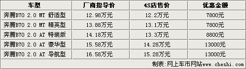 據(jù)一汽奔騰汽車(chē)4S店銷(xiāo)售人員介紹,目前09款奔騰B70現(xiàn)車(chē)顏色不全,主要以銀色車(chē)型為主,目前手動(dòng)擋車(chē)型只能優(yōu)惠7800元;上市不久的自動(dòng)特裝版能夠優(yōu)惠8800元;而另外兩款自動(dòng)擋車(chē)型現(xiàn)在能夠優(yōu)惠13000元,如果到店還能有更多的優(yōu)惠政策。2010款奔騰將于九月中下旬推出,目前能夠接受預(yù)訂,訂金為5000元。