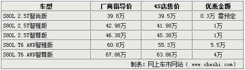 據(jù)4S店銷售人員介紹,目前國產(chǎn)S80L全系智尚版沒有現(xiàn)車供應,需要消費者訂車,訂金為5萬元。除優(yōu)惠5.5萬的T6智雅版外,其它幾款車也可以分別優(yōu)惠1萬到4萬元不等,到店詳談還可以有更多的優(yōu)惠。