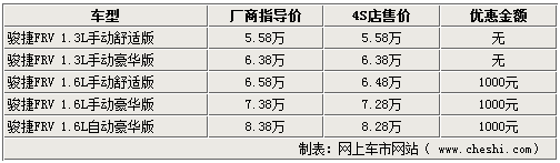 駿捷FRV是中華汽車首款兩廂車型,涵蓋排量由1.6L至1.3L的多款車型,全系車型分別在去年5月份和7月份上市,售價區(qū)間為5.58萬元至8.38萬元。網(wǎng)上車市網(wǎng)站近期了解到,一直處在預(yù)訂銷售狀態(tài)的1.3L車型已經(jīng)到店,而店內(nèi)的1.6L駿捷FRV全系優(yōu)惠1000元。詳情如下: