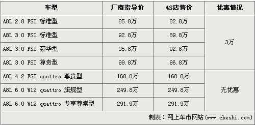 據(jù)北京奧迪經(jīng)銷店銷售人員介紹,2.8L和近期剛上市的3.0L店內(nèi)有現(xiàn)車,并且購買的消費(fèi)者可以得到3萬元的優(yōu)惠。經(jīng)優(yōu)惠后,全系最低配的2.8 FSI標(biāo)準(zhǔn)版售價(jià)從85.8萬元下降到了82.8萬元。銷售人員還介紹,4.2L以及6.0L Quattro版車型均無現(xiàn)車,欲購買著需交10萬訂金,等半年左右才可提車。