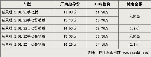 根據北京雪佛蘭4S店銷售人員介紹,由于2010款新景程將要上市,所以在款的景程已經停產,并且店內已沒有手動擋現車,自動檔現車數量有限。經1.9萬元優(yōu)惠后,2.0L自動舒適版的售價降到了12.78萬元,2.0L自動豪華版經2.1萬元優(yōu)惠后售價也降到了14.18萬元。