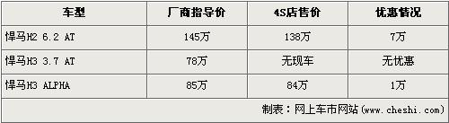 據(jù)北京悍馬經(jīng)銷店銷售人員介紹,目前市場上在售的悍馬分為H2 6.2L和H3 3.7L以及H3 5.3L ALPHA 三款車型。近期購買悍馬H2 6.2L車型的消費者可以得到7萬元的優(yōu)惠,經(jīng)優(yōu)惠后售價降到了138萬元。H3 3.7L店內(nèi)沒有現(xiàn)車,所以沒有任何優(yōu)惠。H3 ALPHA經(jīng)1萬元優(yōu)惠后,售價從85萬元下降到了84萬元。