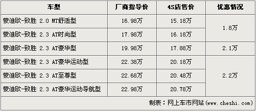 福特蒙迪歐-致勝出自福特最新開發(fā)的EUCD技術(shù)平臺(tái),它采用了沃爾沃S80底盤技術(shù)。在歐洲,蒙迪歐致勝與皇冠成為競(jìng)爭(zhēng)對(duì)手,是一款定位高于雅閣、凱美瑞之流的轎車。近日據(jù)網(wǎng)上車市價(jià)格系統(tǒng)檢測(cè)顯示,蒙迪歐-致勝全系最高優(yōu)惠2.2萬(wàn)元,具體車型價(jià)格詳情請(qǐng)看下表: