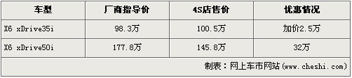 據(jù)北京寶馬經(jīng)銷店銷售人員介紹,現(xiàn)在在售的X6車型分為售98.3萬元的35i車型和售價為177.8萬元的50i兩款車型。目前購買35i車型的消費者沒有優(yōu)惠,提現(xiàn)車還要加價2.5萬元,售價從98.3萬元上升到了100.8萬元,排量更大的4.4升的50i車型有32萬元的現(xiàn)金優(yōu)惠,售價降到了145.8萬元。銷售人員還介紹,近期50i車型車型沒有現(xiàn)車,消費者需交訂金10萬元,下個月可提車。