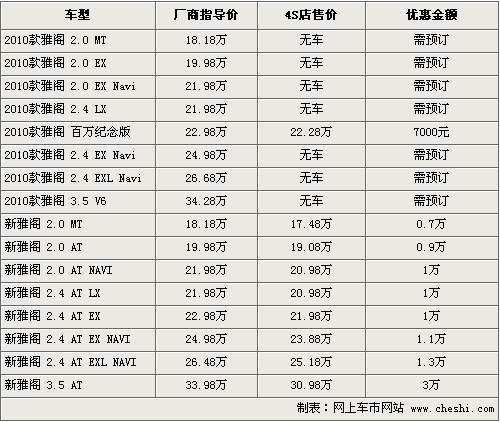 據(jù)4S店銷售人員介紹,目前部分2010款百萬紀(jì)念版雅閣新車已經(jīng)到店,消費(fèi)者購車的話可以優(yōu)惠7000元。其他款車型還需要預(yù)訂,訂金為2000元,F(xiàn)在店內(nèi)08款車型最高可優(yōu)惠現(xiàn)金3萬元,入門級(jí)車型優(yōu)惠現(xiàn)金7000元,以2.0手動(dòng)檔為例,優(yōu)惠后僅首17.49萬,F(xiàn)在店內(nèi)有黑色、銀色等可供消費(fèi)者選擇。