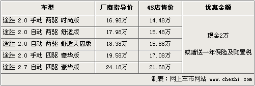 據(jù)北京現(xiàn)代北京地區(qū)4S店銷售人員介紹,途勝車型優(yōu)惠現(xiàn)金2萬元或贈送購置稅及全年保險,兩 項優(yōu)惠只能選擇其一。目前店內(nèi)現(xiàn)車供應(yīng)主要為銀色、黑色為主,四驅(qū)部分車型需要預(yù)訂,訂金5千元,一周左右時間可以提車。如消費者有意購買,到店詳談會有 更優(yōu)惠的價格。北京地區(qū)各4S店由于訂單不同,各店銷售的現(xiàn)車顏色有所不同。