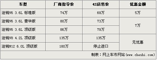 途銳是大眾首款引進我國的SUV車型,在3.6L及4.2L率先上市后,大眾為了滿足消費者的更大胃口,緊接著又推出了搭載12缸發(fā)動機的6.0L車型。隨著大排量消費稅的頒布,給9月份后入關的大排量車型帶來了一次不小的沖擊,令大排量汽車價格都上調了不少。近日據(jù)網上車市價格系統(tǒng)監(jiān)測顯示,大眾途銳的6.0L車型已經停止進口,并且購買目前購車可以得到最高7萬元的優(yōu)惠,具體詳情請看下表: