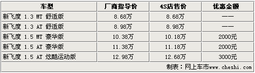 廣汽本田新飛度一直以時尚的外觀,經(jīng)濟的油耗和精細的內飾做工贏得了不少年輕都市白領的認可。根據(jù)網(wǎng)上車市價格監(jiān)測系統(tǒng)顯示,目前新飛度最高優(yōu)惠3千元左右,1.3L車型需預訂。具體車型行情如下: